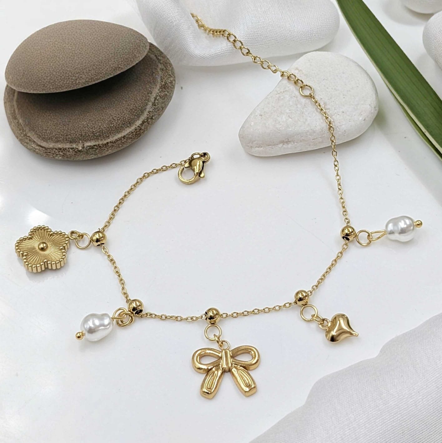 18K Gold Plated Anti-Tarnish Charm Bracelet – Waterproof Stainless Steel Jewelry with Pearl, Bow, Heart, and Flower Charms
