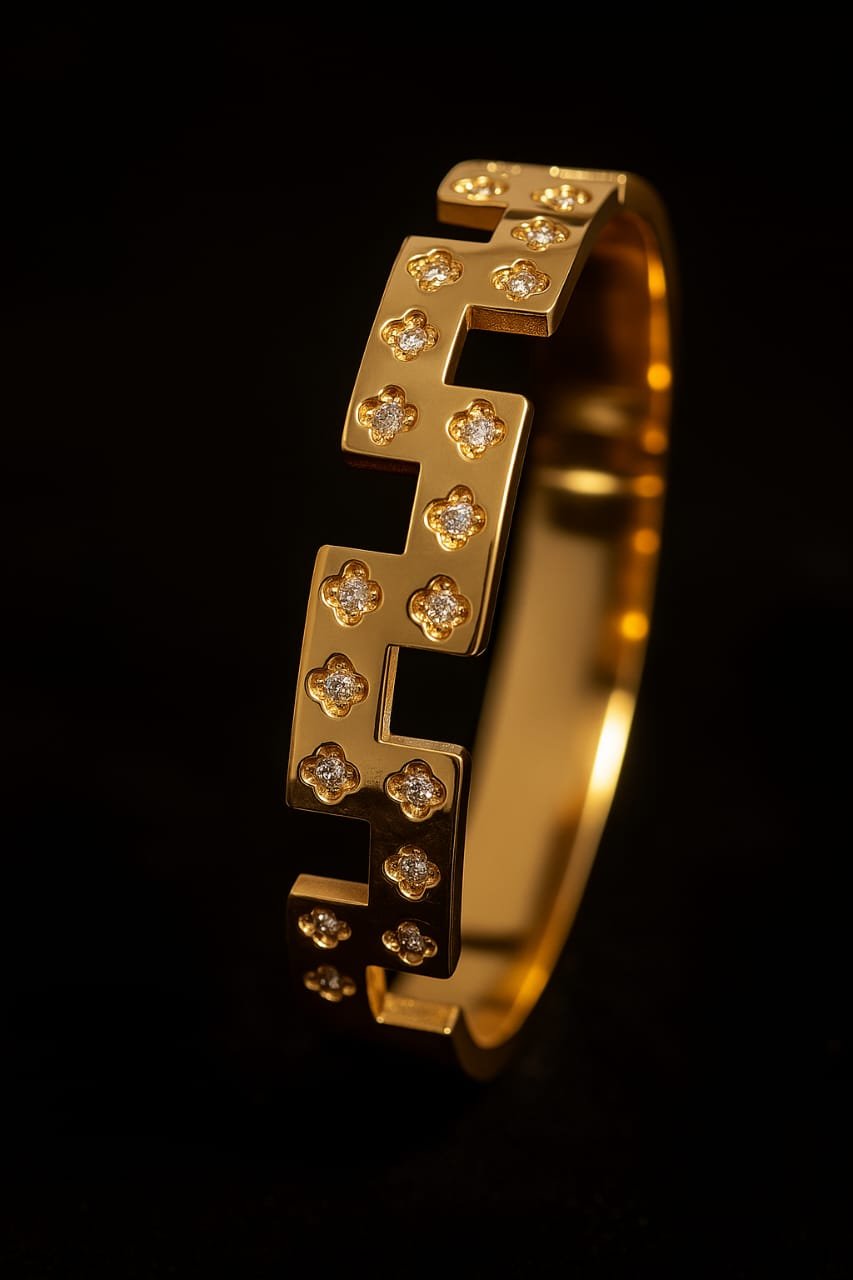 Anti-Tarnish Gold Plated Zigzag Pattern Kada | Modern Geometric Cuff Bangle with Floral CZ Diamonds