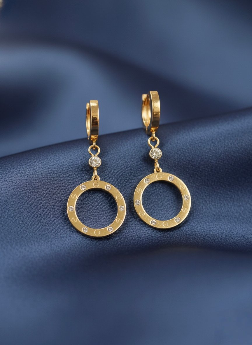 18K Gold Plated Anti-Tarnish Love-Inspired Circle Drop Earrings with Crystals — Waterproof & Hypoallergenic