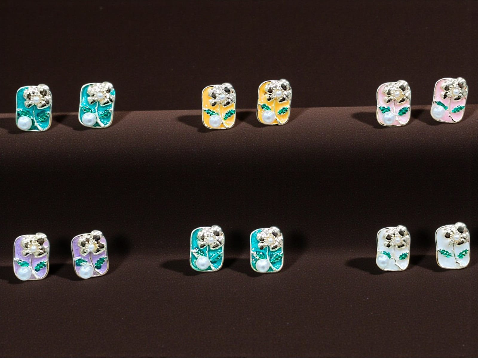 Mini Floral Enamel Stud Earrings with Pearl Accents (6 Pairs)