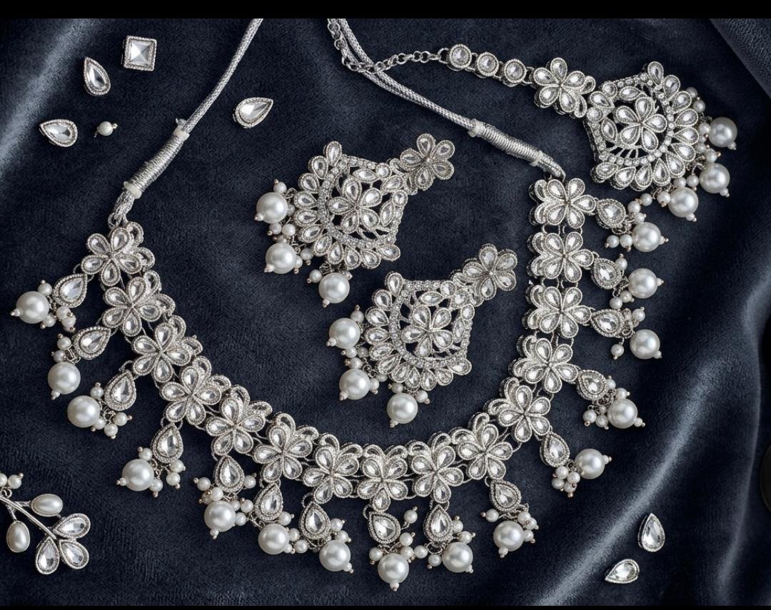 SILVER PEARL KUNDAN NECKLACE WITH TIKKA KN12