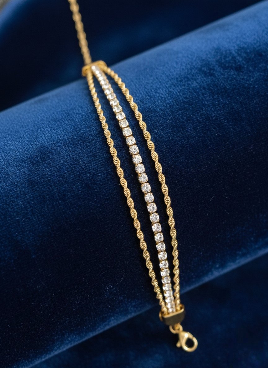 Be the first to review “The Trinity Layered Bracelet: Waterproof Gold Rope & Crystal Tennis Chain” Cancel reply
